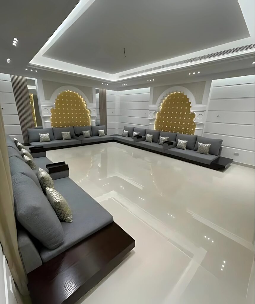 This luxurious Majlis seating set is designed for traditional and modern interiors, offering comfort, elegance, and cultural charm. The L-shaped floor seating features high-quality upholstery with plush cushions, providing a relaxing and cozy atmosphere. The dark wood accents add a touch of sophistication, perfectly complementing the neutral grey fabric. The gold-patterned wall panels enhance the Arabian-inspired design, making it ideal for large family gatherings and guest seating. Perfect for homes, hotels, and majlis rooms, this seating set combines style, durability, and functionality for a welcoming environment.