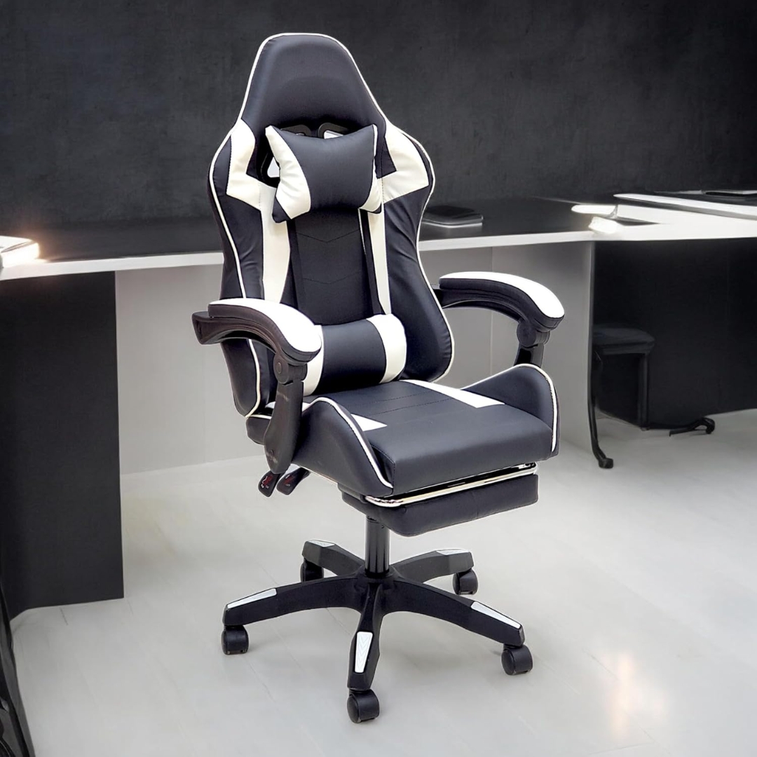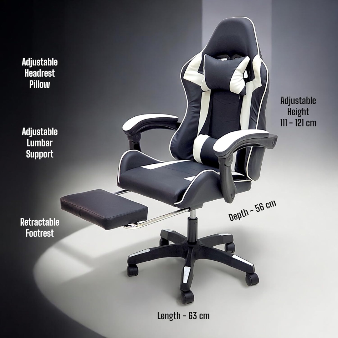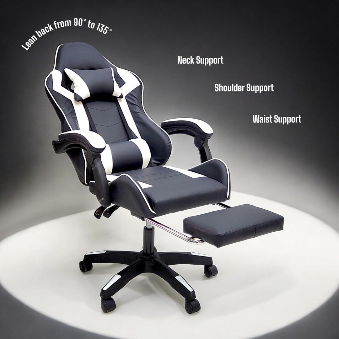 High Back Gaming Chair with Footrest – Premium Leather, Padded Armrests, Adjustable Height, Headrest Cushion & Reclining Backrest, Swivel Office Computer Chair (White Black)